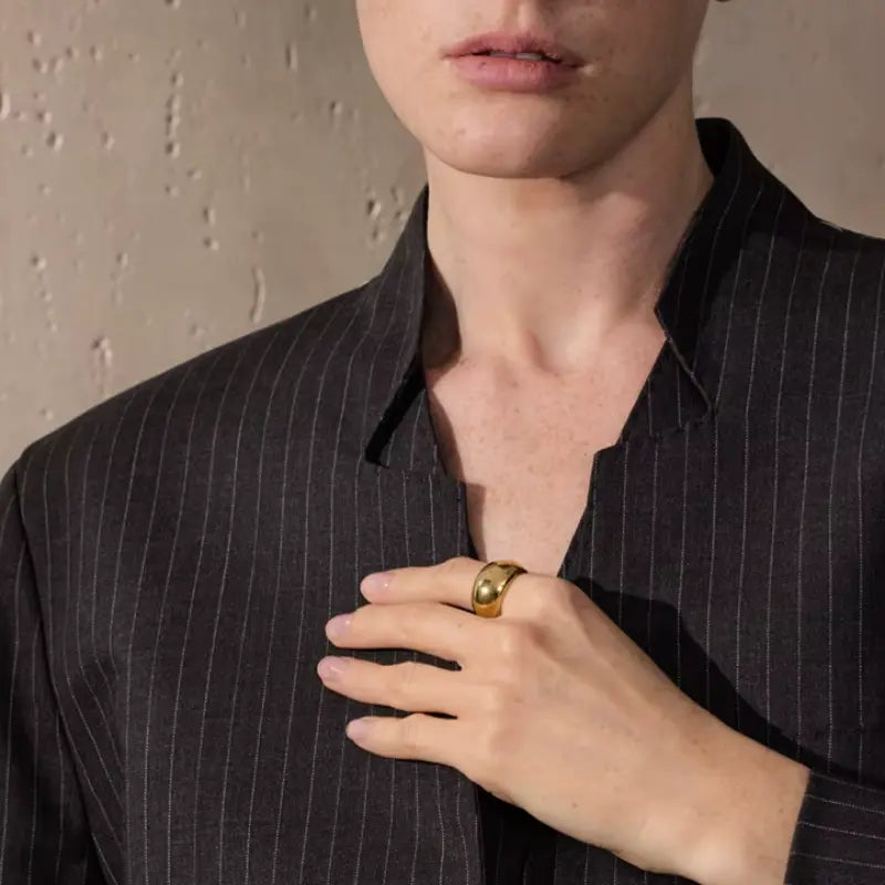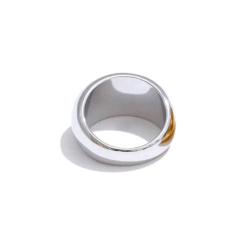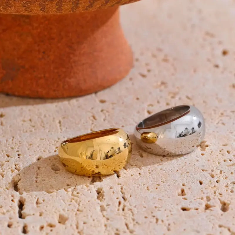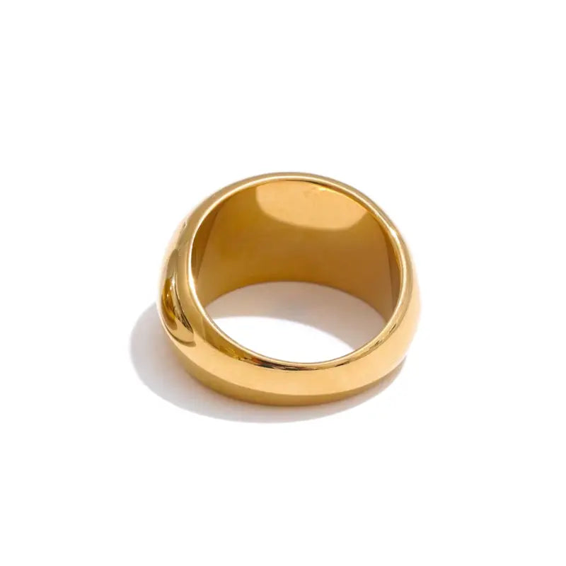 Fabriquée en acier inoxydable plaqué or 18K, cette bague est résistante à l’eau, hypoallergénique et pensée pour un usage quotidien malgré son volume généreux. Elle ne ternit pas et conserve son éclat au fil du temps. Son intérieur lisse garantit un confort optimal.