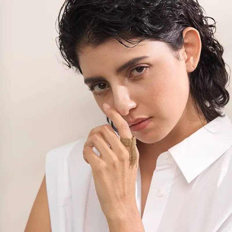 Les breloques chaînes, finement travaillées, apportent une touche contemporaine et dynamique à cette bague. Leur léger mouvement crée un effet visuel élégant et unique. Facile à porter, cette bague s’adapte aussi bien à un look casual qu’à une tenue plus sophistiquée.