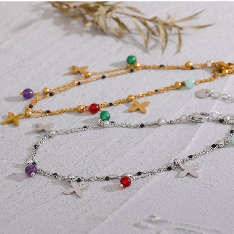 Découvrez notre magnifique bracelet inoxydable fleurs dorées avec pierres naturelles colorées, un bijou qui combine l'éclat du doré avec la beauté naturelle des pierres. Si vous recherchez un bracelet qui ajoute une touche de délicatesse et de couleur à votre poignet, ne cherchez plus, ce bracelet acier inoxydable est fait pour vous. Le bracelet est ajustable pour s'adapter parfaitement à votre poignet, offrant un confort optimal tout au long de la journée. Que vous le portiez seul pour un look délicat et féminin ou en combinaison avec d'autres bracelets pour un style audacieux, il ajoutera une touche d'élégance florale à chaque tenue.