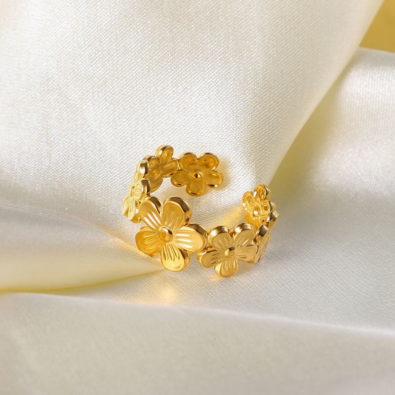 Notre bague acier inoxydable en fleurs dorées est un véritable chef-d'œuvre artisanal. Les détails minutieux des fleurs dorées apportent une touche d'éclat enchanteur, mettant en valeur votre main avec une élégance discrète. Réalisée en acier inoxydable de haute qualité, cette bague offre une brillance durable tout en résistant à l'usure quotidienne. Son design ajustable rend cette bague adaptable à différentes tailles de doigts, vous permettant de la porter selon votre préférence. Que vous la souhaitiez serrée ou plus relâchée, elle s'ajustera parfaitement à votre doigt, offrant un confort incomparable.